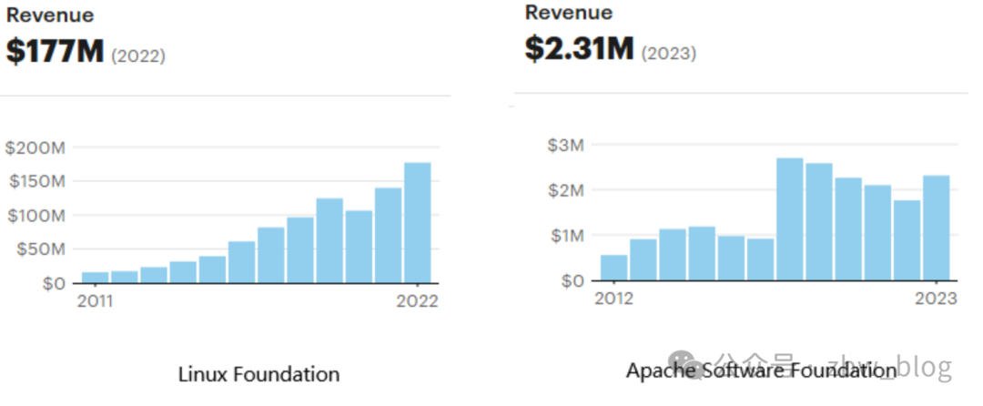 众多开源基金会也在蓬勃发展,其中 Linux 基金会和 Apache 基金会极具代表性。据 ProPublica 数据,2022 年 Linux 基金会收入高达 1.77 亿美元,旗下拥有 30 多个子基金会,管理着 600 多个开源项目。Apache 基金会在 2023 年的收入达 231 万美元,管理着近 300 个开源项目。这些开源项目作为全球数字基础设施的关键组成部分,正发挥着不可估量的巨大作用,有力地推动着全球数字化进程。