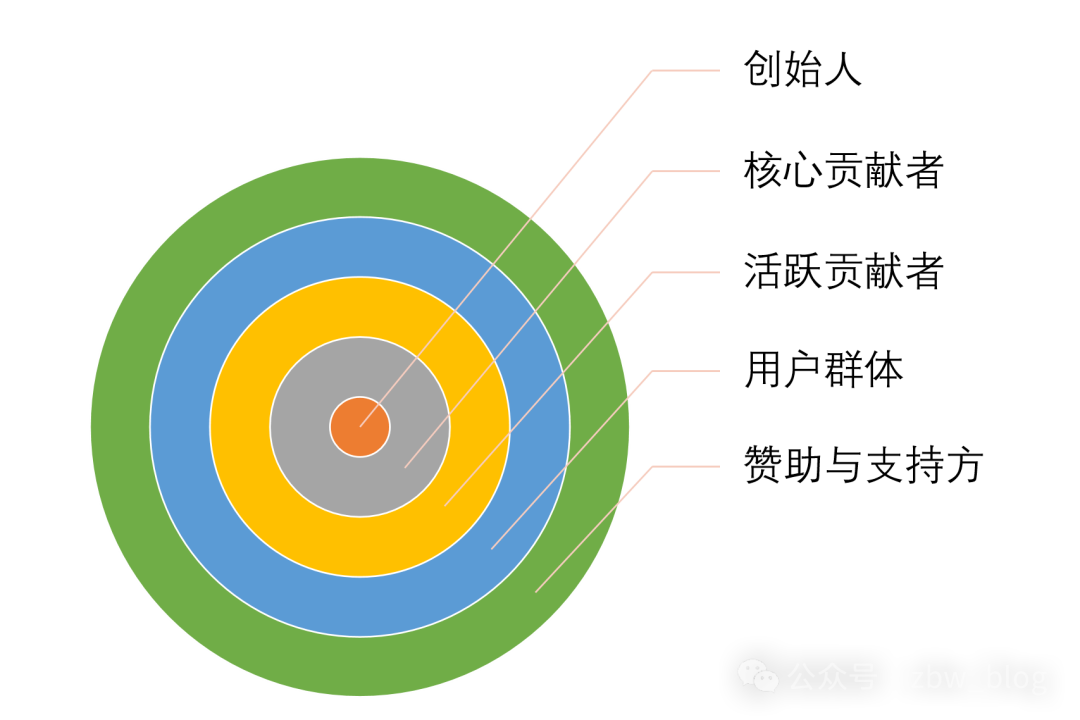 我们可以把开源社区想象成一个同心圆,不同位置的人扮演着不同的角色,共同推动项目前进。