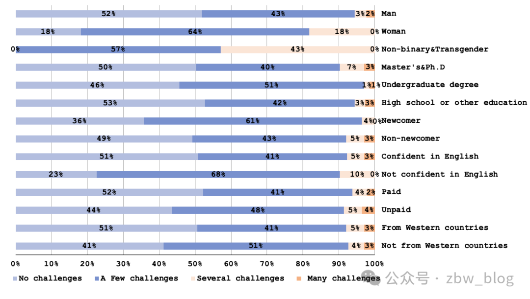 更多的女性、更多的非二元性别与跨性别者、更多的新来者、更多的非英语国家或非西方国家的贡献者(受访者),都会面临更多、更大的挑战。从开源社区应该更多的接纳不同来源的贡献的角度,这些受到阻碍的贡献者,这些可能最终离开的贡献者,都是开源社区的损失。